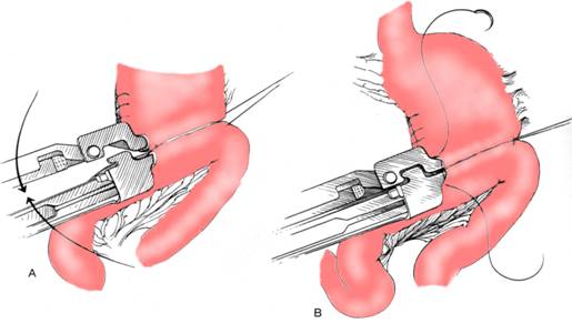 Fig. 10 - Rezectie gastrica 2/3 Billroth II - anastomoza gastro-jejunala cu staplerul liniar: A. introducerea bratelor staplerului; B. aplicarea agrafelor si sectiunea cu cutter-ul (4)