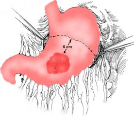 pentru a fi corecta rezectia trebuie sa cuprinda 2/3 distale din stomac intinzandu-se spre dreapta pana la zona fixa din prima portiune a duodenului si spre stanga pana la linia care uneste locul in care coronara abordeaza stomacul pe mica curbura si locul de anastomoza dintre cele doua artere gastro-epiplooice pe marea curbura;