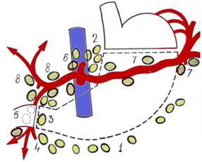 Fig. 13 - Gastrectomie radicala subtotala in cancer polar inferior: grupele ganglionare evidate (1)