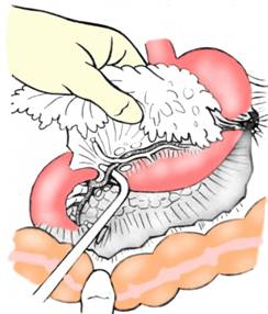 Se trece la eliberarea micii curburi si a marginii superioare a duodenului prin disocierea din aproape in aproape a micului epiploon in pediculi mici si, prin ligatura vaselor pilorice, razant cu marginea superioara a duodenului juxtapiloric (Fig. 2).