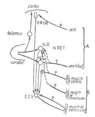 Daca in trecut nucleului rosu i se atribuia un rol deosebit in mentinerea rigiditatii de decerebare, astazi, aceasta stare se explica prin doua tipuri de influente tonice asupra musculaturii striate: unele care pleaca de la substanta reticulata a trunchiului cerebral si ajung la maduva pe calea fasciculului reticulospinal si altele care pleaca de la nucleul vestibular Deiters, mergand spre maduva prin fasciculul vestibulospinal. Fibrele ambelor fascicule se pun in legatura cu motoneuronii alfa si gama din coarnele anterioare spinale determinandu-se facilitarea activitatii lor (fig.10).
