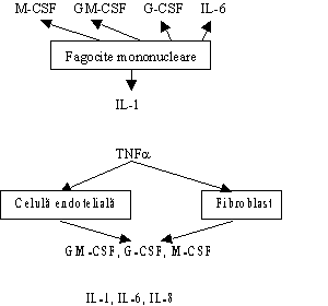 fagocitele mononucleare secreta M-CSF, GM-CSF, G-CSF, IL-6, IL-1 si TNFa; IL-1,