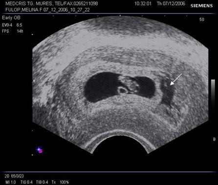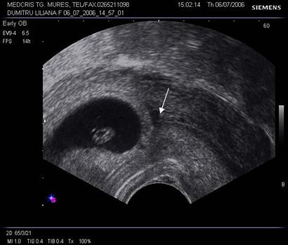 Fig. nr. 73 Hematom organizat subchorial ( sageata , iar cu linie e marcat sacul ovular, se remarca diferenta de ecogenitate atat dintre cele doua, cat si fata de peretele uterin )