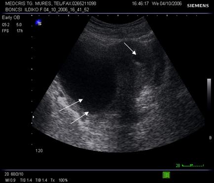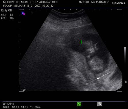 Fig nr 68 Decolare de pol inferior la ecografia abdominala ( sageata )