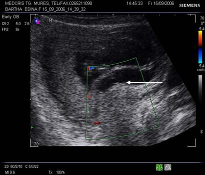 Fig nr. 70 Aceeasi sarcina ca in figura precedenta,la eco Doppler se observa lipsa fluxului sangvin in hematomul subchorial ( sageata)