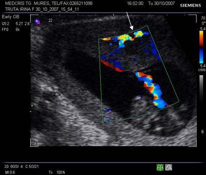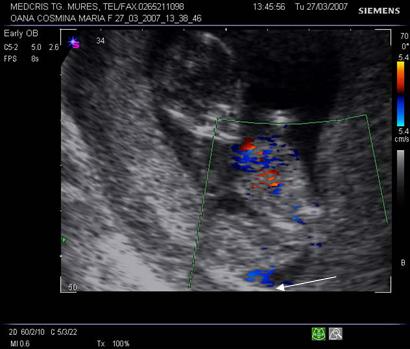 Fig. nr. 7 La nivelul hematomului retroplacentar se observa intreruperea circulatiei sangvine uteroplacentare ( sageata). Fluxul sangvin la Doppler, prin cordon ombilical, indica o sarcina in evolutie