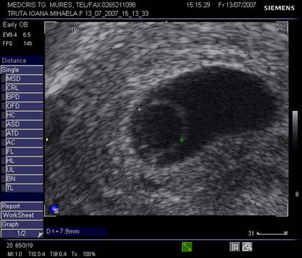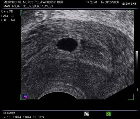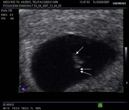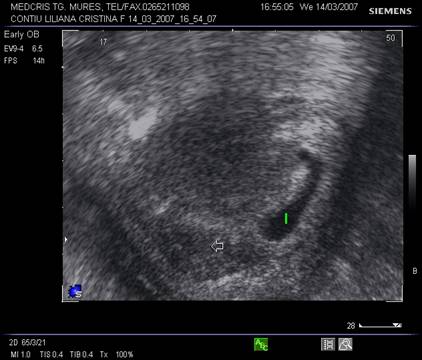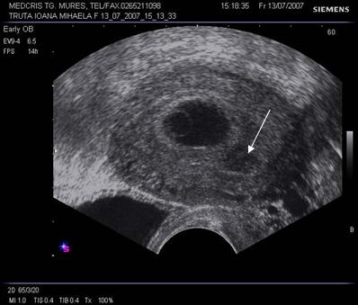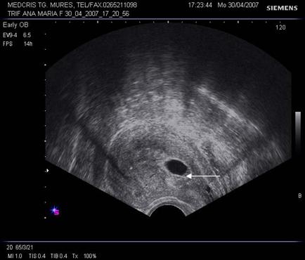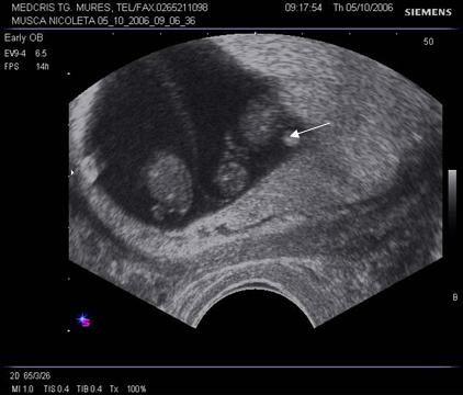 g nr 8 Cavitate chorionica (anecogena) prea mare, fata de un embrion si vezicula vitelina mici ( hiperecogene, cu una respectiv doua sageti ), la o sarcina oprita in evolutie