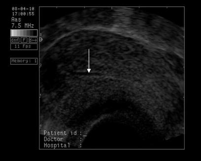 (cu sageata, zona cu ecogenitate medie )