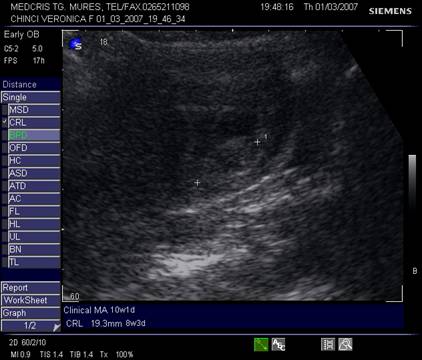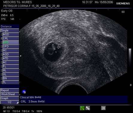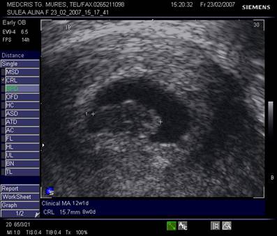 Fig nr.83 Discrepanta dintre lungimea cranio caudala embrionara (CRL intre calipere) ce corespunde la 8 saptamani si amenoreea de 12 saptamani, se remarca absenta veziculei viteline