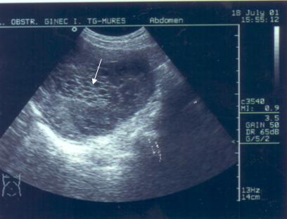 Fig nr 87. Aspect caracteristic de placentatie cu vacuole hipoecogene(cu sageata) , in sarcina molara ( prin amabilitatea dr. Molnar V. Claudiu )