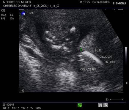 Ecografic, dispozitivul apare ca o structura ecogena cu forma variabila, localizat alaturi deasupra sau sub sacul gestational, eventual in canalul cervical.