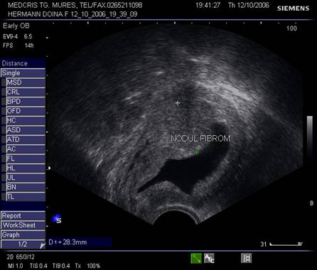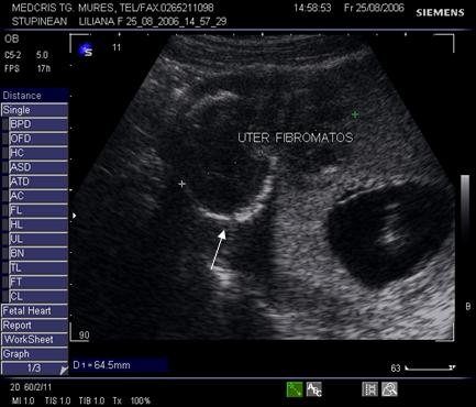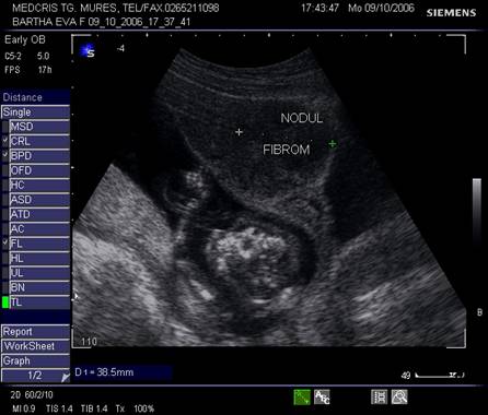 Fibromul apare de obicei hipoecogen in uterul gravid, trebuind masurat si observat pe parcursul sarcinii.