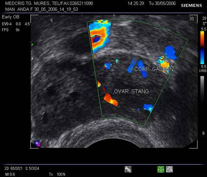 Cea mai frecventa formatiune anexiala este corpul galben fiziologic. El apare ca o umbra bine circumscrisa, anecogena initial, apoi formatiunea adiacenta uterului regreseaza, spre deosebire de alte formatiuni chistice ovariene. Regresia schimba aspectul ecografic spre o formatiune inomogena cu ecou anecogen central.[4,8]