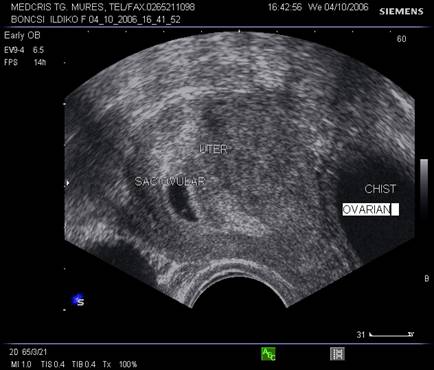 Fig. nr. 96. Aceeasi sarcina ca in figura precedenta, retrouterin chist ovarian evident la ecografia transvaginala
