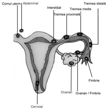 interstitiala: sacul gestational localizat in miometru este greu de diferentiat de sarcina incipienta intrauterina sau de cea intr-un corn uterin la uterul bicorn. Se complica cu hemoragie interna masiva.