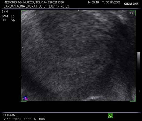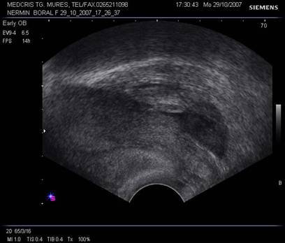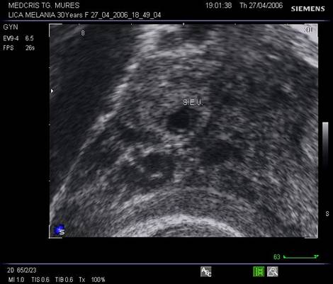 Fig nr 62 Sectiune transversala la nivel corpului uterin , la ecografia transvaginala. Parauterin, in trompa stg., se evidentiaza o formatiune inomogena cu ecou hipoecogen relativ central