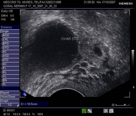 Fig nr 55 Langa ovarul stang, o formatiune ovalara ( intre calipere ) de 18 mm, cu ecou hipoecogenic central, la 6 sapt.de amnoree