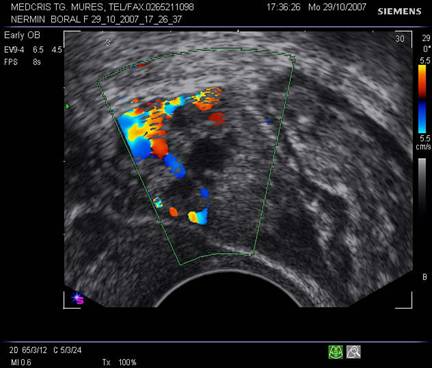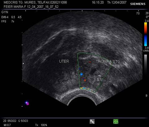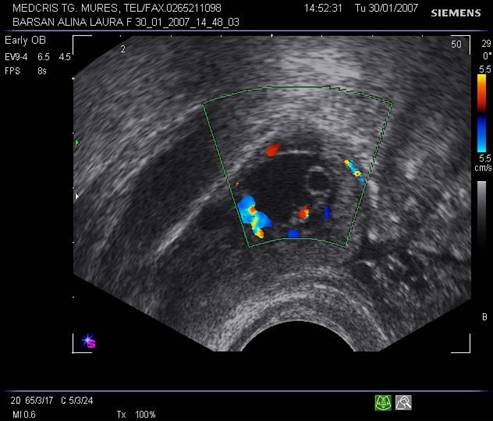 Fig nr 57 La exam. Doppler color, formatiunea retrouterina, cu ecou hipoecogen central, are o buna vascularizatie ( aceeasi sarcina tubara pavilionara ca in fig. precedenta )