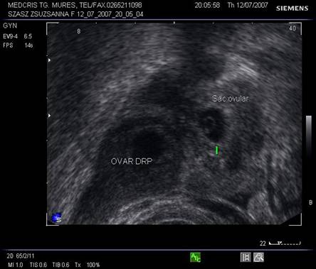 Fig nr 54 In sacul gestational ectopic se evidentiaza vezicula vitelina, ecou discret hiperecogen rotund