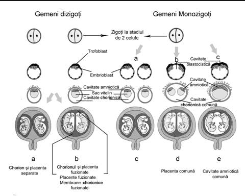 Monozigotismul: diviziunea ovulului fecundat, in diverse momente precoce ale dezvoltarii sale, determina 4 varietati anatomoclinice de sarcina gemelara monozigotica.