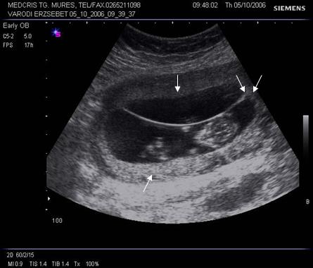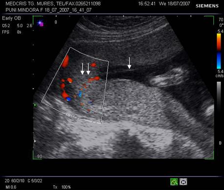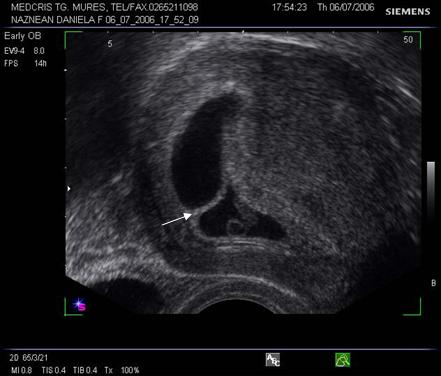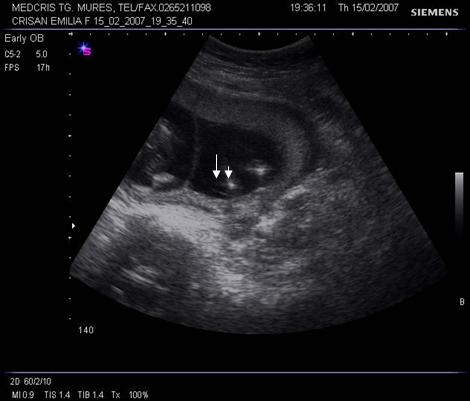 Fig nr 41 Sarcina 12 sapt. biamniotica bichoriala, cu doua placentatii pe peretele anterior, respectiv posterior uterin ( cate o sageata ).Cele doua sageti alaturate indica semnul descris de Wood ca half twin peak