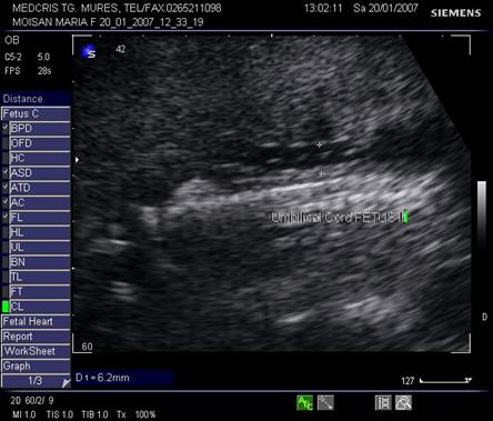 Fig nr 49. Sarcina 19 sapt. ,cu tripleti , biamniotica bichoriala, cu sindrom transfuzor transfuzat la fetii monoamniotici, cu retard de crestere intrauterina si cordon ombilical cu diam . pe jumatate la transfuzor ( intre cele doua calipere ) fata de transfuzat ( fig urmatoare )