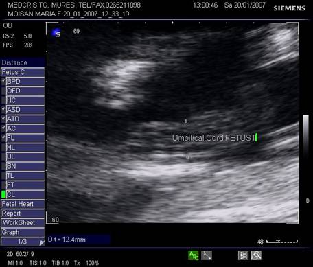 Fig nr 50. Cordonul ombilical al fatului transfuzat , dublu fata de cel al transfuzorului, in diametru ( intre calipere )