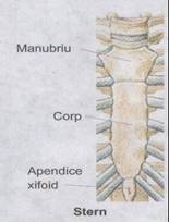 b. Sternul este un os lat, situat anterior, pe linia mediana a toracelui. Este format din manubriu sternal, corp si apendice xifoid (cartlaginos).