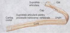 c. Coastele in numar de 12 perechi, sunt oase late, formate dintr-un arc osos si o portiune cartilaginoasa. Prezinta un cap, cate doua fete articulare, un gat si un corp.