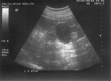 rinichiului drept, mica zona hiperecogena, rotunda, care deformeaza conturul