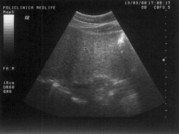 Figura 9. In mod normal, parenchimul renal este mai hipoecogen decat perenchimul hepatic.