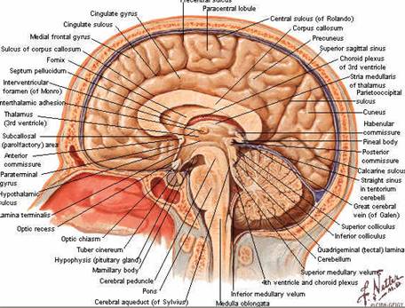 Chiar sub emisferele cerebrale se afla o serie de formatiuni nervoase foarte importante:hipotalamus, hipofiza si epifiza. Hipotalamusul intervine in termoreglare, aportul de alimente si lichide, diureza, functii sexuale, somn, reglarea circulatiei, respiratiei si anumite stari emotionale (frica si furia). Hipofiza, situata la baza creierului, in saua turceasca, secreta o serie de hormoni: somatotropul, care contribuie la cresterea organismului, deficitul sau ducand la nanism iar excesul la gigantism, tireotropina, care stimuleaza secretia tiroidiana, corticotropina, stimuleaza secretia corticosuprarenalei, gonadotropinele (hormonul foliculostimulant si hormonul luteinizant), regleaza activitatea gonadelor atat la femeie cat si la barbat, controland secretia hormonilor sexuali, prolactina, care stimuleaza dezvoltarea glandei mamare si mentine secretia lactata, hormonul melanocitostimulator, care provoaca pigmentarea pielii, in lipsa acestuia pielea decolorandu-se (albinism).Desi extrem de mica, hipofiza (glanda pituitara) joaca un rol primordial in armonizarea celorlalte glande endocrine, fiind numita "dirijorul glandular". Controlul secretiei tuturor acestor hormoni este realizat de catre hipotalamus, cu care hipofiza este strans legata. La randul sau, hipotalamusul secreta doi hormoni ce sunt transportati pana la nivelul hipofizei, de unde se elibereaza direct in sange: antidiuretic, care are ca actiune conservarea apei in organism prin scaderea eliminarilor hidrice renale; lezarea hipotalamusului sau a hipofizei provoaca diabetul insipid, datorat deficitului de hormon antidiuretic, manifestat prin eliminarea unor cantitati mari de urina, concomitent cu ingestia unor cantitati insemnate de apa si ocitocina, responsabila de ejectia laptelui si contractia musculaturii uterine in travaliu. Epifiza, situata in mijlocul creierului, desi are doar marimea unui bob de grau, este considerata sediul sufletului sau "al treilea ochi"; atinge dezvoltarea maxima in copilarie, dupa care incepe sa involueze inainte de pubertate; are legaturi nervoase cu retina si secreta melatonina, in functie de intensitatea luminii: lumina puternica scade sinteza, iar intunericul are efecte stimulatoare. Melatonina are efecte inhibitoare asupra eliberarii hormonilor gonadotropi hipofizari si asupra axului hipotalamo-hipofizo-corticosuprarenalian.