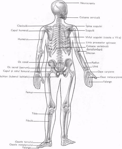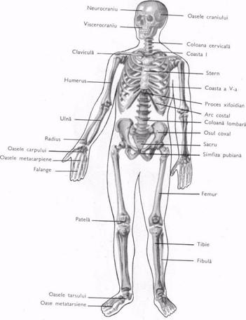 Scheletul este format din peste 200 oase. Acestea sunt alcatuite dintr-un corp (diafiza), ce contine in interiorul ei canalul medular, in care se gaseste maduva osului si doua extremitati (epifize). Maduva oaselor este de doua feluri: rosie, cu rol in producerea globulelor rosii ale sangelui, si galbena, care contine multa grasime si provine din maduva rosie, in care s-a depus grasime.