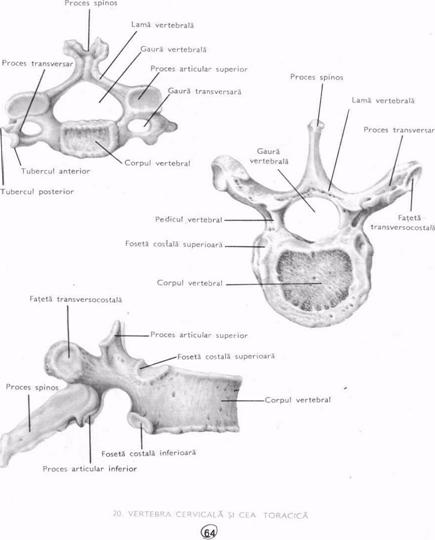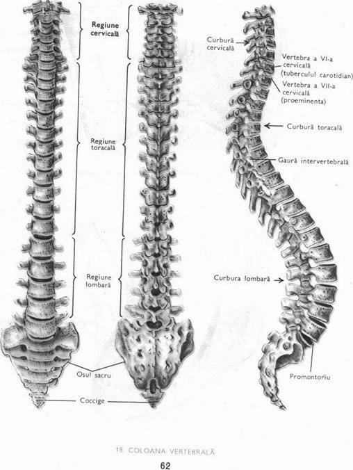coloana vertebrala, alcatuita din 34 de vertebre, impartite dupa regiunile carora le apartin: 7 cervicale, 12 toracale, 5 lombare, 5 sacrale si 5 coccigiene.