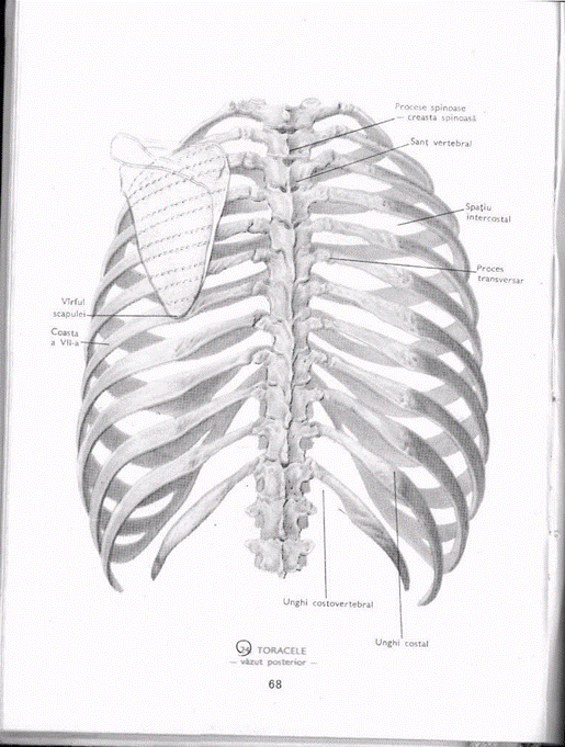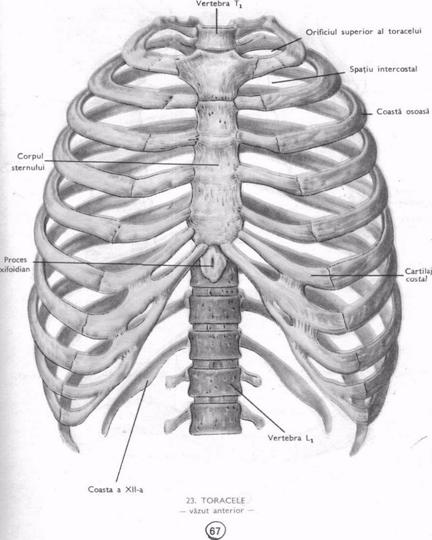 coaste, in numar de 12 perechi, din care primele 10 perechi se unesc cu sternul, ultimele doua perechi sunt "coaste flotante".