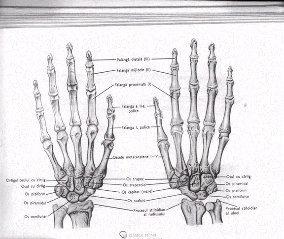 o mana, alcatuita din oasele carpiene (8), metacarpiene (5), falange (14)