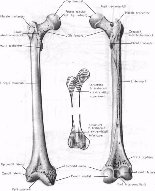 o coapsa, reprezentata prin femur. In zona articulatiei genunchiului se afla un os mic, rotula