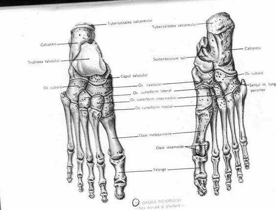 o piciorul, format din oasele tarsiene(7), metatarsiene (5) si falange (14)