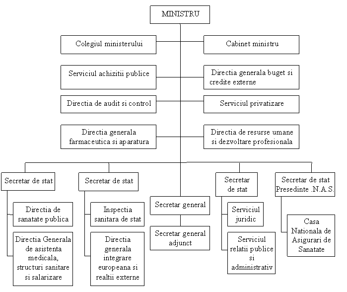 Dupa cum se observa din schema nr.1, conducerea Ministerului Sanatatii este exercitata de catre ministrul sanatatii, acesta reprezentandu-l in raporturile cu alte ministere, autoritati si organizatii, precum si cu persoane fizice sau juridice din tara ori din strainatate. In indeplinirea atributiilor sale ministrul sanatatii este ajutat de 4 secretari de stat, de un secretar general si de un secretar general adjunct. Ca organ consultativ este infiintat Colegiul ministerului, al carui presedinte este deasemenea ministrul sanatatii, Colegiu ce se intruneste pentru dezbatera unor probleme privind activitatea Ministerului Sanatatii.