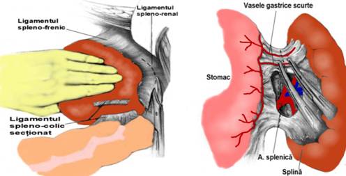 Odata expusa cavitatea retrogastrica, splina se poate mobiliza usor evidentiindu-se ligamentul spleno-renal care se sectioneaza, fapt ce permite mobilizarea completa a splinei. Se sectioneaza ligamentul spleno-colic tinand colonul la distanta: Se separa prin disectie boanta coada pancreasului. Se clampeaza vena splenica si se aplica doua ligaturi pe bontul ei proximal. Se sectioneaza artera, pe bontul proximal raman doua ligaturi de matase 0. Se ligatureaza si se sectioneaza vasele restante.