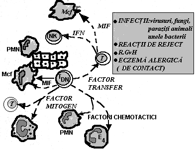 Lf si a Mcf), factorul de transfer (induce eliberarea MIF si a IRN din Lf nespecifice). Toti acesti factori cu rol amplificator atrag un numar impresionant de celule la locul conflictului: LfPMN, bazofile, eozinofile si (in special) Mcf. RHT reprezinta mecanismul efector principal in variate conditii clinico-patologice: reactii fata de virusuri, fungi, paraziti animali si bacterii cu localizarea intracelulara in unele boli autoimune si in respingerea grefelor (Fig.77)