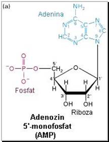 Figura 2 Toate nucleotidele au acelasi plan general de structura. (a) Structura chimica a riboadenozin 5'-monofosfatului (AMP), nucleotid prezent in moleculele ARN. (b) Structura chimica a celor 2 zaharuri prezente in moleculele de acizi nucleici: riboza in ARN si 2-deoxiriboza in ADN. |