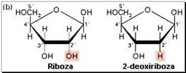 - zaharul din ARN (riboza) contine o grupare hidroxil in plus fata de deoxiriboza (prezenta in ADN);