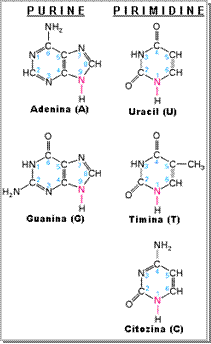 Adenina si guanina sunt baze azotate derivate din structura purinei si, ca atare, mai sunt numite si baze purinice (sau, simplu purine). Timina, citozina si uracilul sunt derivate din structura pirimidinei - baze pirimidinice/pirimidine (Figura 2). In mod curent, cele 5 baze azotate se prescurteaza A, T, C, G si, respectiv, U.