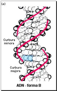 Dublu-helix ADN de forma B. Scheletul glucido-fosforic (in gri si marcat cu linii rosii) se afla la exteriorul