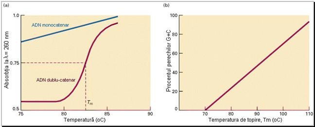 Figura 8 Variatia absorbantei in denaturarea termica a ADN. (a) Denaturarea ("topirea") moleculelor de ADN d.c. poate fi monitorizata prin variatia absorbantei in lumina ultravioleta 260 nm: pe masura ce ADN denatureaza, absorbanta creste pana aproape de dublu. Temperatura la care jumatate din molecule sunt denaturate poarta numele de temperatura de topire (Tm). (b) Valoarea Tm depinde de continutul in guanina si citozina a moleculelor de ADN d.c.: cu cat procentul molar de guanina - citozina (%molGC) este mai mare, cu atat este mai mare si valoarea Tm.