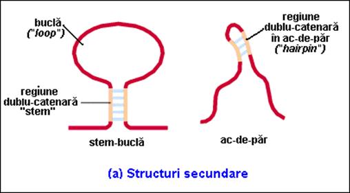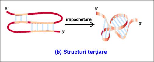 Figura 11 Structuri secundare (a) si tertiare (b) in moleculele de ARN; aceste structuri se formeaza pe baza existentei unor zone cu complementaritate intracatenara.