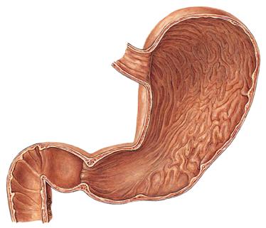 - tunica mucoasa sau mucoasa stomacala - este prevazuta cu numeroase plici gastrice longitudinale anastomozate. Are o grosime de aproximativ 2 mm si este formata dintr-un epiteliu cilindric simplu printre care se afla glandele unicelulare ce secreta mucus.