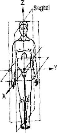 b) Planuri de orientare. Prin doua axe ale corpului trece un plan. Astfel se formeaza frontal, sagital si transversal. Planul frontal este paralel cu fruntea si imparte corpul in doua jumatati: anterioara si posterioara. Nu este plan de simetrie si este determinat de axele longitudinale si transversale. Planul sagital este un plan vertical, care trece prin axa longitudinala si sagitala. Este un plan de simetrie si imparte corpul in doua parti (dreapta si stanga). Planul transversal sau orizontal trece prin axa sagitala si axa transversala perpendicular pe planele frontal si sagital, imparte corpul in doua par i nesimetrice: superioara si inferioara.