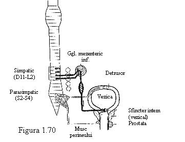 Ø fibrele eferente simpatice au originea in centrii D11-L1 formand nervii splanhnici cu sinapsa in ganglionii mezenterici inferiori, cu fibre postganglionare ce se distribuie la sfincterul intern neted al vezicii urinare, determinand contractia acestuia;